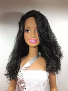 | barbie my size 38 hispanic dark skin dkinned diy hair fix clean dress clothes how to sew make for long hair close up black brown |