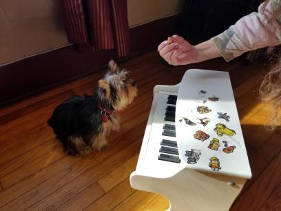 | yorkie plays learns trick piano yorkshire dog puppy taining |
