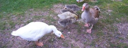 | Pilgrim pair of Geese - gander is white on left, goose is grey and white on right - 2011-12-10 23:22:17 |