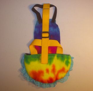 This one is for an older Gosling or a Duck and will fit your gosling for weeks. It is Tye-Dye Print with turquoise lace trim and oh so cute. They grow so fasssssst! If it arrives and it would be a bit too big, wait and try it on your baby goose again. This Goose Diaper Holder can be lined with a sanitary napkin, a human baby diaper, a folded newspaper page. The two liners and the Goose Diaper Holder are hand or machine washable, hang to dry.