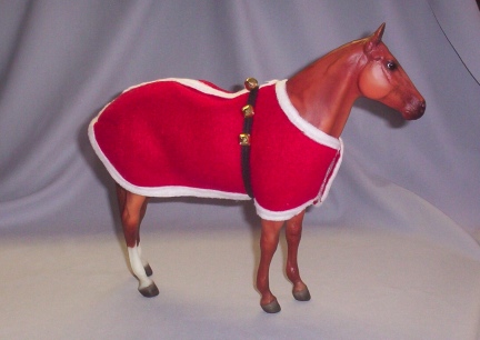I crafted this Santa Coat with five ringing gold toned bells with my own patterns and ideas. The coat closes under the horse and at the chest with velcro. It will fit your Traditional Size Breyer Horse.