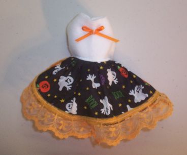 These little dresses are made in a variety of ways. This one is a Halloween Print with a White polar fleece top complete with a little orange bow and orange lace trim.