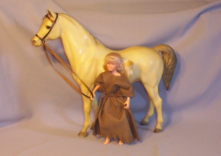 I designed and hand crafted this American Indian Dress with with my own patterns and ideas. The belt goes around the dolls waist and can tie in the back or the front. The photo of the dress is taken on a 6 1/4" Breyer Doll. The dress is left a bit long for the larger dolls. It will, of course, fit a bit shorter on an 8" doll. It can also be trimmed for a shorter fit. It is split on each side so that the doll may be mounted on a Model Horse.