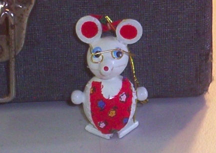 Just a cute little shelf setter. It is about 2 1/2" tall and made of wood. Has a cute little fabric bow and apron. This cute rattie/mouse has a pair of wire glasses and a gold string hanger.