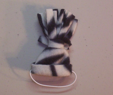 This is cute and even cuter with a rat head under it. It is made out of a Zebra Print polar fleece. It stays on the ratties head with elastic. The elastic is left long when it arrives to you so that you can cut it or tuck it to fit your own rattie.