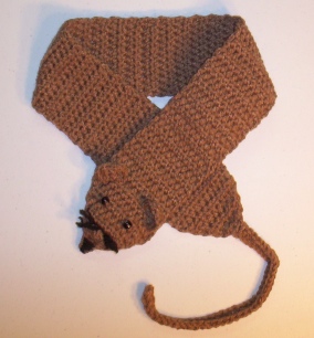 The scarf has been hand crocheted stitch by stitch. It is approx. 32" long not including an approx 10" tail and is about 3 1/2" wide. The rat is brown with black pony bead eyes and black yarn for the nose and whiskers. The ears stand out.