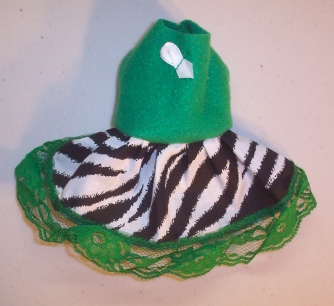 All of my items are my own design and pattern. This one is a cute little Zebra Print Dress with Green fleece top and Ribbon Trim.