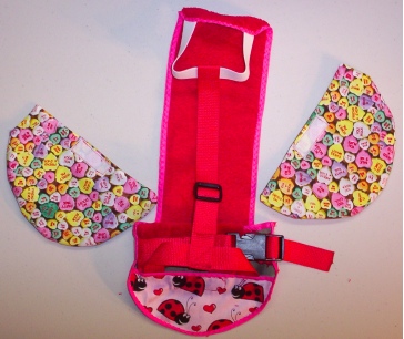 This Goose Diaper Holder Harness is made with Valentine's Day Print, backed with a waterproof fabric complete with Hot Pink trim. This Goose Diaper Holder can be lined with a sanitary napkin, a human baby diaper, a folded newspaper page.