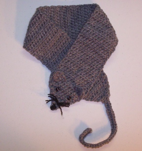 The scarf has been hand crocheted stitch by stitch. It is approx. 30" long not including an approx 9" tail and is about 4" wide. The rat is gray with black pony bead eyes and black yarn for the nose and whiskers. The ears stand out.