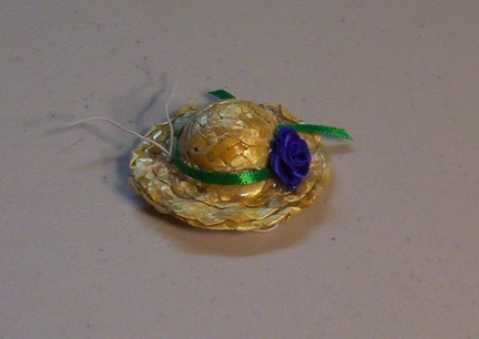 This is cute and even cuter with a rat head under it. It is a rat sized and has a little flower with a ribbon hat band, quite a Lady Rat Bonnet. It stays on the ratties head with elastic. The elastic is left long when it arrives to you so that you can cut it or tuck it to fit your own rattie.