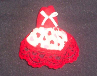 These little dresses are made in a variety of ways. This one is a Cute Heart Print dress with Lace and a tiny Bow! I wish the photos showed the outfits better then they do.