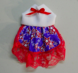 All of my items are my own design and patterns and are made in NW SD USA in our non smoking home. This one is a cute little Star Print Skirt, White Top w/ little fancy bow and red lace.