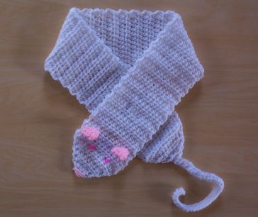The scarf has been hand crocheted stitch by stitch. It is approx. 29" long with an approx 9" tail and is about 3 1/2" wide. The rat is white with koool pink bead eyes and pink yarn for the nose. The ears stand out.