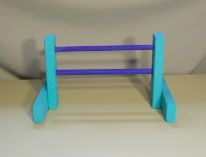 It is made with a wood and sets up by placing the bars into the wholes ready for it in the Jump Stand. This was hand cut, hand sanded, hand painted and hand put together in NW SD USA. It is ready to go.