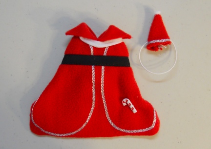 All of my items are my own design and pattern. This is a cute little idea was Santa Inspired. It is made with Red fleece with Fancy Silver Trim and has a white pom pom on the hat. It has a black belt and a Candy Cane on the hip.