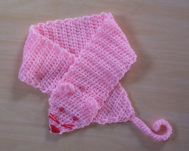 The scarf has been hand crocheted stitch by stitch. It is approx. 32" long with an approx 7 3/4" tail and is about 4 1/4" wide. The rat is Pink with Red pony bead eyes and Red yarn for the nose and whiskers. The ears stand out.