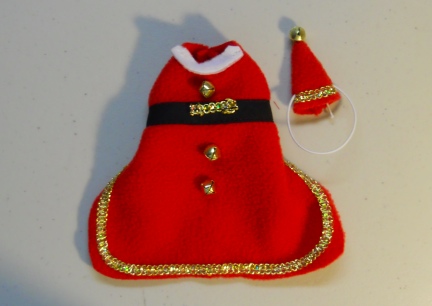All of my items are my own design and pattern. This is a cute little idea was Santa Inspired. It is made with Red fleece and has Fancy Gold Trim and a ringing bell for buttons and the matching hat. Gold Trim "Belt Buckle".