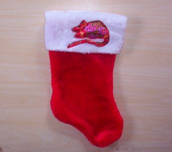 This is a fun item. It is a typical fuzzy Christmas Stocking with a Red Rattie Cut Out in Oriental Print. Thus!! A Year of the Rat Christmas Stocking.