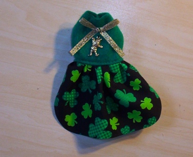 These little dresses are made in a variety of ways. This one is a Cute St. Pat's Dress made from Green Polar Fleece with a cute Shamrock Print and Lace. It has A Gold bow from the pot of Gold on the blouse of the outfit as well as a cute little Leprechaun Gold Toned Charm under the bow.