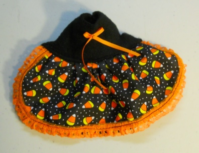 These little dresses are made in a variety of ways. This one is a cute Candy Corn Print with a Balck polar fleece top complete with a little Orange bow and Orange lace trim.