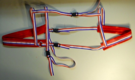 This harness is Red/White/Blue Striped poly webbing with RED polar fleece padding. It will fit most goats from the Dairy Breeds and a few from the Meat Breeds. FOR CUSTOM COLORS, CHECK OUT OUR CUSTOM HARNESSES.