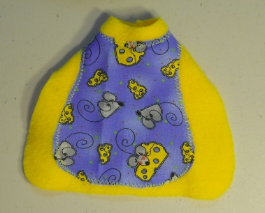 These little coats are made in a variety of ways. This one is a Cute Rat or Mouse and Cheese Print fabric over Bright Yellow Polar Fleece..