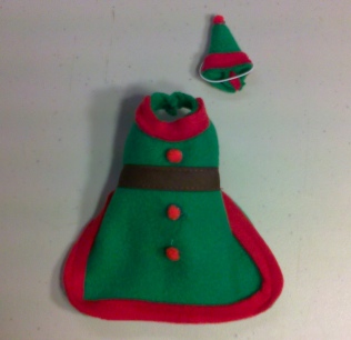 All of my items are my own design and pattern. This is a cute little idea was Santa's Elf Inspired. It is made with Green fleece has three Red pom poms with Red polar fleece trim. The hat has adjustable elastic with matching itty bitty Red Pom Pom on the top! The outfit also has a little Brown "belt". Your item may vary slightly from the photo.