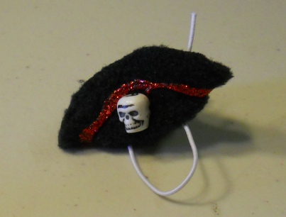This DELUXE HAT is made in the trifold manner as my other PiRATe hats. This one has Fancy Red Glitter Trim on the the brim with a cute little SKULL BEAD sewn on the front.