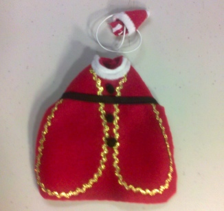 All of my items are my own design and pattern. This is a cute little idea was Santa Inspired. It is made with Red fleece and has Fancy Gold Trim and a Traditional Santa Hat.