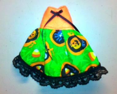 These little dresses are made in a variety of ways. This one is a Cute Green Halloween Print trimmed with Black Lace and has a Orange polar fleece top complete with a little bitty Black Bow. THIS ITEM IS MADE UP AND READY TO SHIP, IT WAS HAND CRAFTED IN OUR NW SD NON SMOKING HOME FROM PATTERNS I CREATED. The item you receive may vary slightly from photo.