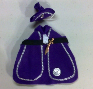 These little costume is adorable with a little Purple fleece Pirate Coat complete with Fancy Silver colored Trim front,a PiRATe Captain's Hat with a cute little Silver toned Rattie Charm and a little Metal Sword at the waist. There is a lot of hand work in this outfit!