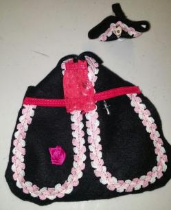 This little costume is adorable with a a Rose colored Rose on the hip, a Skull Bead on the Hat, Red Lace at the collar. There is a lot of hand work in this outfit!