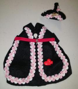 This little costume is adorable with a Double Red Heart on the hi[p, a Skull Bead at the Collar, A Dagger at the Red Belt,a PiRATe Captain's Hat with a Gold Colored Rat Charm. There is a lot of hand work in this outfit!