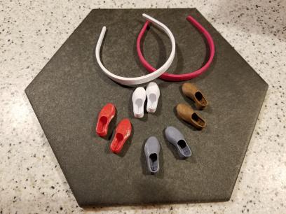 These are really cute and were made for the Chubby Blythe Dolls that are on Mimi Bobeck Bodies. With this lot you will receive all 4 pairs of shoes, white, brown, gray, and red, as well as 2 Headbands, white, red.