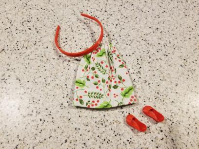 With this lot you will receive what you see in the photo. The cute little Jolly Holly Print Skirt, the RED Pair of Shoes (that click on from the little toe over and STAY on the foot!) as well as the matching Headband.