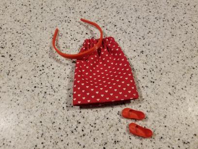 With this lot you will receive what you see in the photo. The cute TINY Heart Print Skirt, the RED Pair of Shoes (that click on from the little toe over and STAY on the foot!) as well as the matching Headband.