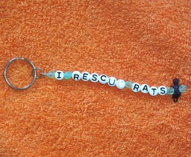 I make and design most of the items I sell including but not limited to this I RESCUE RATS Key Chain with a rat charm. The key chain is approx. 7 1/2" long and has one black 1" rat charms and five ice blue beads. The keys go unto a split ring that is about 1 1/4".