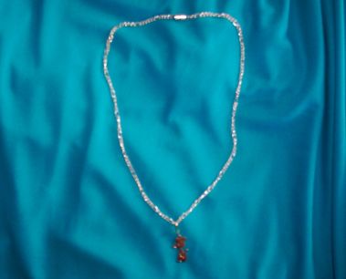 THIS NECKLACE IS APPROX. 17" LONG, WITH AN ICE BLUE BEAD AND A SILVER RATTIE (or mouse). Cute for dress up or with jeans!