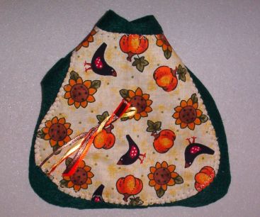 These little coats are made in a variety of ways. This one is a Cute Little Fall print and or Thanksgiving coat. It has a cute little three ribbon trim and is all over forest green fleece.