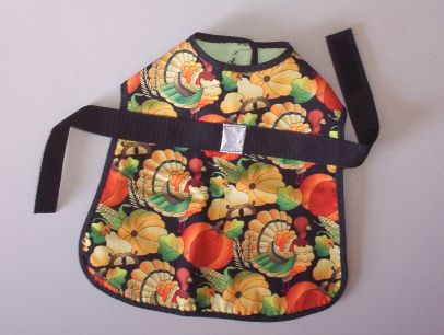This is a cute little fleece lined Turkey/Fall Dog Coat with a little sliver "belt buckle" on the black belt. The measurements are approx., from behind the neck to tail 9 1/4" and the waist is adjustable with velcro will fit a dog with up to 18" . The coat attaches with adjustable velcro. (This coat could also be worn by a rabbit, cat or a large guinea pig.)