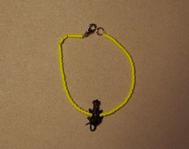 This is a cute little bracelet made of Yellow seed beads with a black approx 1" charm. The bracelet is approx. 7 1/2" long. This bracelet has a "lobster claw" type closer.