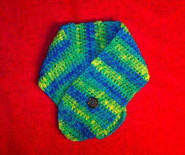 The scarf has been hand crocheted stitch by stitch. It is approx. 28" long and is about 5" wide. It has a large button to not only keep it on your neck but also make it very adjustable for all size necks.