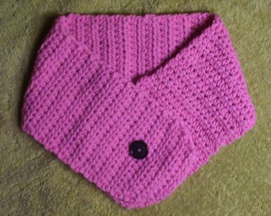 The scarf has been hand crocheted stitch by stitch. It is approx. 31" long and is about 5 1/2" wide. It has a large button to not only keep it on your neck but also make it very adjustable for all size necks.
