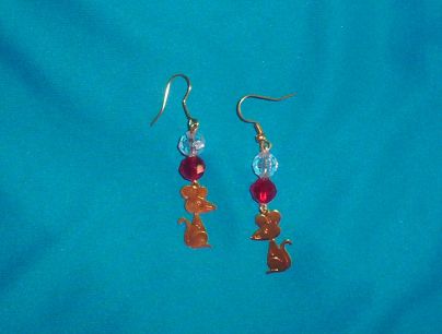 These are some cute earrings! They hang down about 1 3/4" from the earring wire. The ratties are gold toned with Red and Clear beads (think Rubies and Diamonds).The photo angle/shot is not great, much cuter and brighter colors when hanging from ears. They were designed made by me with gold toned fish hook type pieced earrings.