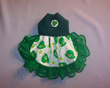 These little dresses are made in a variety of ways. This one is a Cute Little St. Pat's Top Hat print skirt is trimmed with GREEN Lace and has a cute little green top with a Shamrock Charm sewed to it.