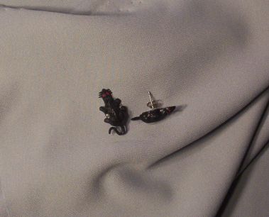 These are fun. They are little black rats are set on silvertoned post earrings settings. The black rattie are approx 1". The photo angle is not great, much cuter when hanging from ears.