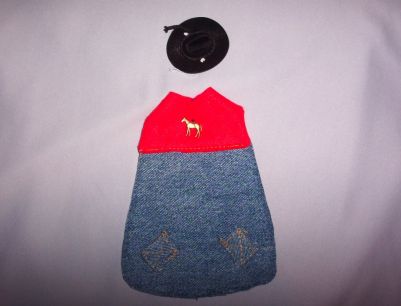 All of my items are my own design and pattern. This is a cute little idea was Cowboy Inspired. It has real and functional jean pockets, a horse charm and a black cowboy hat. The Coat is approx 7" from behind the ratties neck to the tail and the waist is approx. 8 1/4" and will stretch just a bit and closes with velcro under the rat's waist. The hat stays on the rattie's head with elastic.